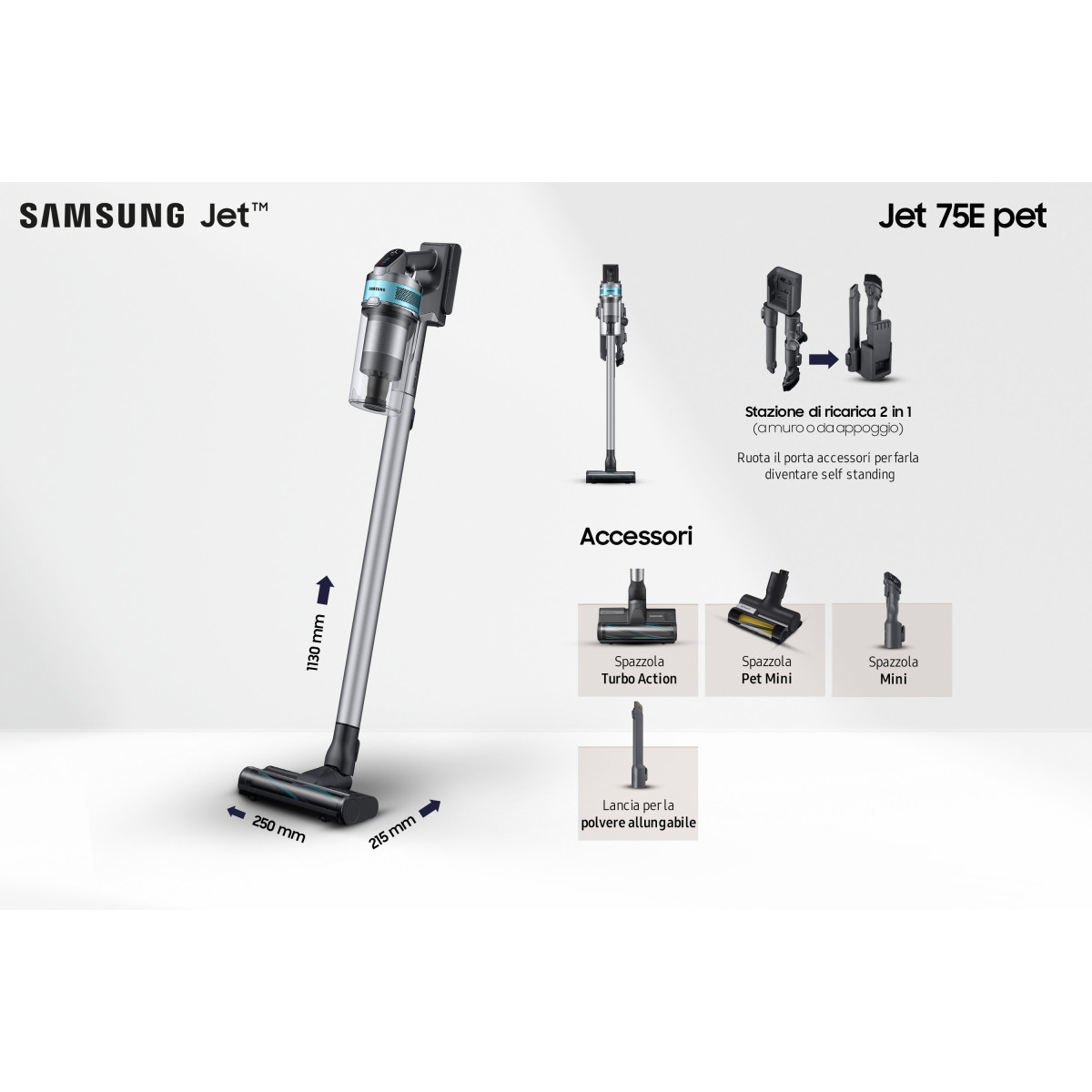 Samsung VS20B75AGR1, Aspirador vertical 2 em 1, Sem bolsa, Preto, Azul menta, Retangular, Seco, Multi ciclónico
