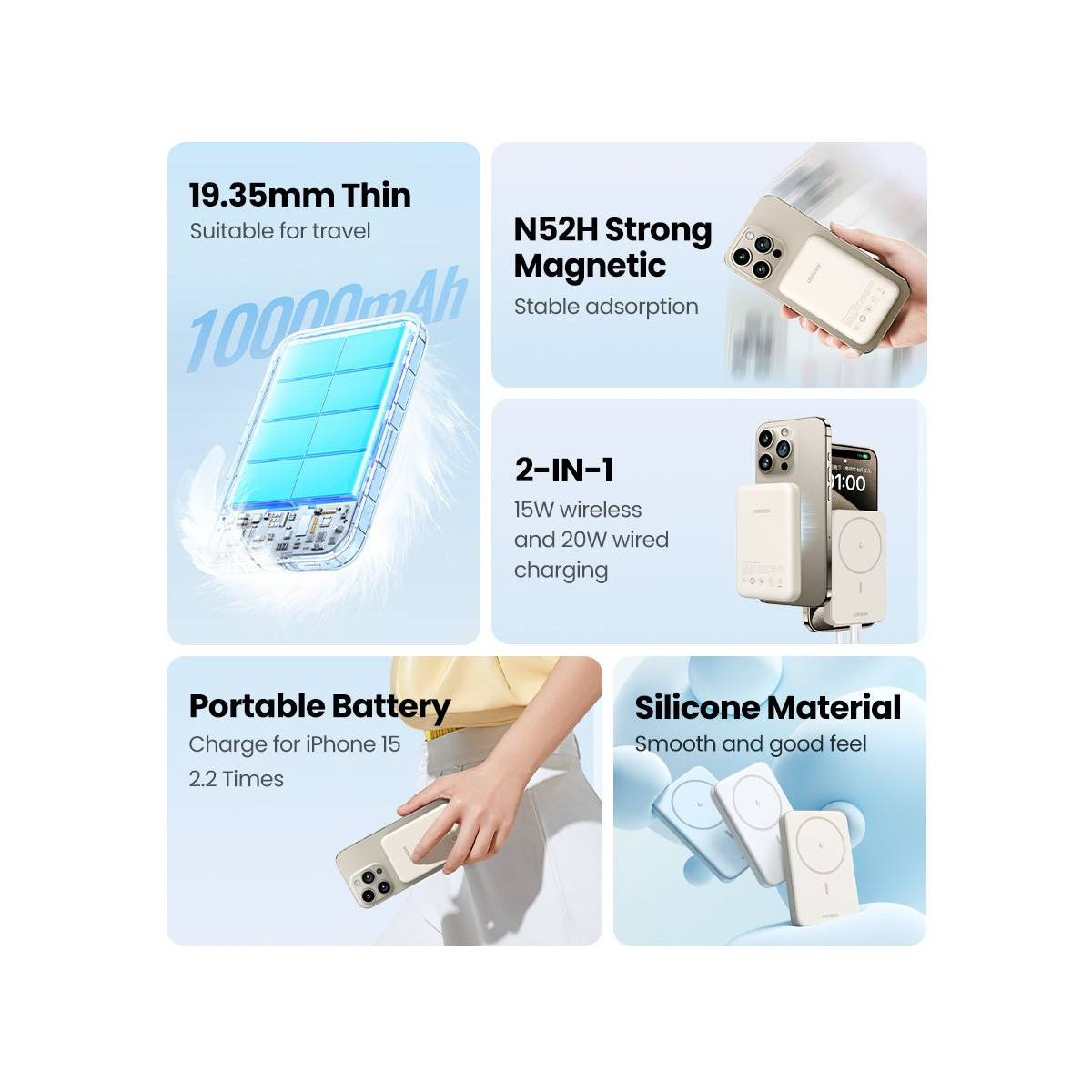 Ugreen 25208, 10000 mAh, Power Delivery 3.0, Carregamento wireless, Bege
